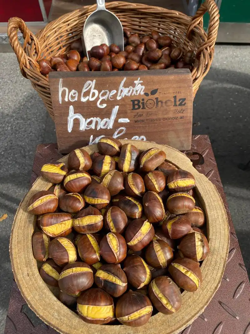 Wenn es draußen wieder kalt, nebelig und feucht wird, dann sind die heißen Edelkastanien und Maroni von Maronessa ein wahrlicher Genuss. Besuchen Sie uns bei unserer Maroni Boutique in der Herrengasse/Ecke Hans-Sachs-Gasse (vor der Buchhandlung Moser) und überzeugen Sie sich selbst von diesem Wohfühl-Moment und dem wunderbaren Duft frisch gebratener Maroni.